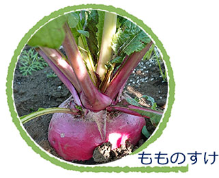 もものすけはナント種苗が開発した赤かぶの一種で、手で簡単に表面の皮が剥け、生のままサラダなどで美味しく食べられるのが特徴となっています。また、かぶの葉もβ-カロテンを非常にたくさん含んだ食材ですので、捨てないでください。